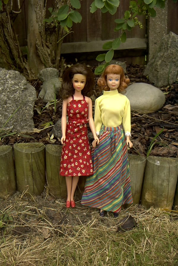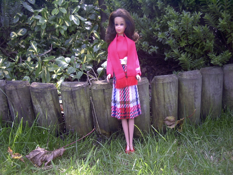 Click on the thumbnails to see bigger photo's, From left to right: A standard blonde centered eye barbie with her box - just need to find her swimsuit! My no-bangs Francie and Midge, a reproduction barbie, Barbie & Ken getting married, and then my original Malibu Barbie in her swimsuit and friends. Gosh, I didn't realize I had quite so many skippers until I took the photo. I have a growing-up skipper (2nd from left). I also have my original skipper - in the yellow dress (4th from right) who is sadly awaiting a left arm transplant as one of my mum's dogs chewed her hand off! Here is my no-bangs Francie in an original Francie outfit 'All about Plaid'. She is very pleased to have a lovely dress and shoes of her own and is all ready for Autumn with her scarf!