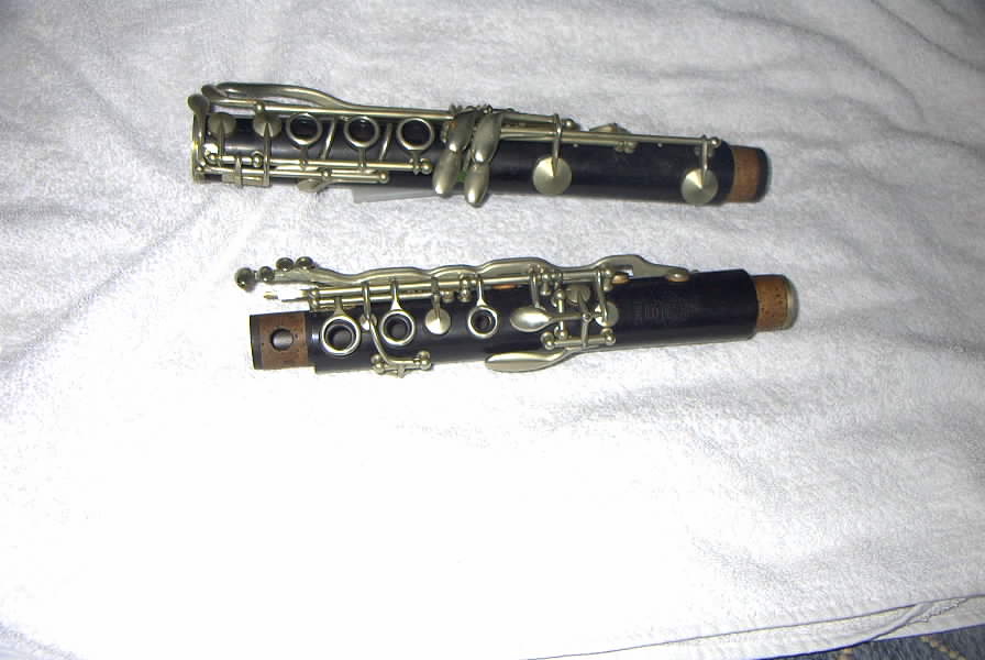 The Clarinet My favourite instrument has to be the clarinet. I seem to have made quite a habit of collecting them over the years. I first started playing at around the age of 9 and still have my first instrument - in pristine condition! I certainly knew how to look after my things. My first clarinet was an Artley Prelude 18S Serial number 5xxxx. My next clarinet I bought in 1995 when I first came back to England to live. It is a Leblanc Infinite and I still play it. An A Clarinet came next - this time a Leblanc Concerto. A beautiful instrument. On one of my trips back to New Zealand my old clarinet/saxophone teacher Arthur Cameron told me he was giving up playing and would l like his old clarinet - well how could I say no! This is also a Leblanc but unusual in that it has an articulated G sharp key and with an extra Bb venting mechanism - probably a Stubbins mechanism. Serial number: 5xxx See photo below - click on the photo for a larger picture. Back view Front view For quite a few years I played Eb clarinet in what was then called Hatfield Concert Band. The Eb I had was a lovely little wooden clarinet with a plastic Boosey & Hawkes LaFleur bell so I can only presume that this is the make of it. My next clarinet purchase was from Ebay - once found an addiction as you could tell from my doll pages. This clarinet is a very old Selmer Bundy Alto Clarinet with open ring keys. I simply love this instrument as old as it is! I play this in the Phoenix Concert Band, occasionally in the Ionian Clarinet Choir and also in the BBC Concert Band. Well once you have an alto - what else do you need? Well along came a bass, again from Ebay. I was slightly disappointed with this purchase as it wasn't as straight forward as it should have been but problems were eventually resolved to a satisfactory conclusion. This bass is again a Selmer Bundy but a more modern version. It plays very sharp and I thought it was me, but after having the opportunity of playing a couple of bass's on the Liverpool Clarinet Summer School, I discover it wasn't! I now have my eye on a Buffet RC Prestige - what a beautiful instrument! It will probably take me years to save up for one! I have upgraded my E flat for a Leblanc Noblet 40, a delightful little instrument so am now trying to sell my first. (I can put this towards my bass savings!) I was also lucky to find a fantastic old, probably rosewood simple system clarinet made by Hawkes & Son in 1875 or 1876. It is in amazing condition and at some stage I will get it re-padded in order to be able to play it although it is in old pitch and probably a C instrument.